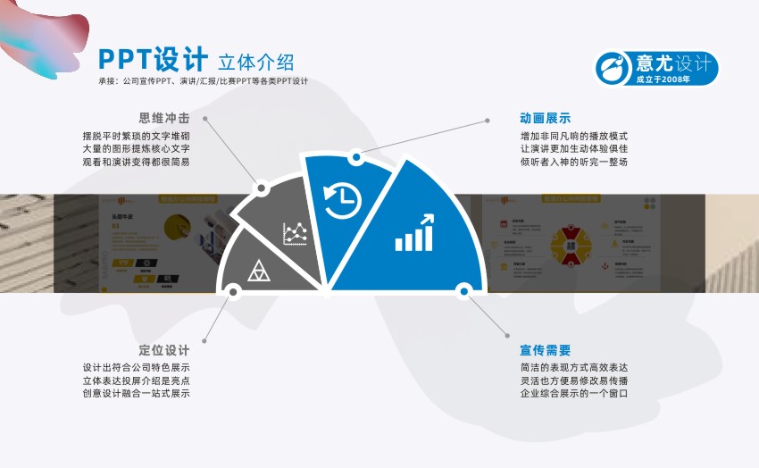 蘇州意尤文化傳播有限公司是一家有著多年廣告設計經(jīng)驗的蘇州知名廣告企業(yè) 主要業(yè)務有蘇州PPT設計、蘇州產(chǎn)品PPT設計、蘇州企業(yè)PPT設計、蘇州會議PPT設計、蘇州項目PPT設計、企業(yè)VI設計、設計印刷宣傳冊/樣本/單頁/名片等 自2007年成立以來,蘇州意尤廣告公司與蘇州及蘇州各市的幾百家中外企業(yè)進行了廣告設計合作,經(jīng)過多年發(fā)展公司已形成了以企業(yè)PPT設計、企業(yè)VI設計,廣告設計,廣告印刷,樣本設計,宣傳冊設計,名片印刷,菜譜制作,單頁,宣傳單等一批特長業(yè)務,相信在各位新老客戶的關(guān)心下,本公司會得到更大的發(fā)展,同時為客戶的發(fā)展宣傳保駕護航。